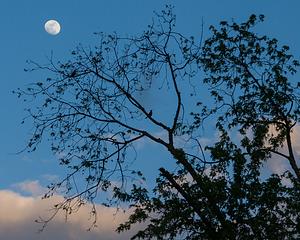 A silhouetted bird sits in a tree with the late evening clouds and waxing gibbous moon in the background.
