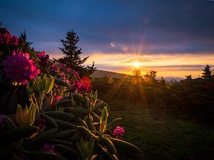 Sunset casts a rim light on the rhododendron bushes giving them a last glow before the next day comes.