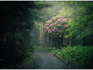A rhododendron bathes in a spot of sun coming through the canopy of the forest.