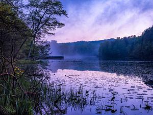 Fog rising off the lake at Bays Mountain Park. Yellow Irises are in full bloom along the lakeside around May.