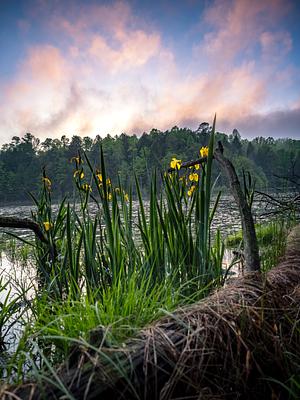 Some of the Yellow Iris that bloom around the lake at Bays Mountain, with a nice colorful spring sunset.