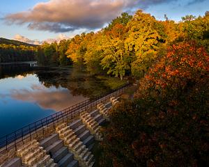 The last bits of warm light sink over the mountain ridge illuminating the fall foliage.