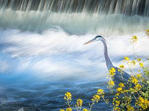 A great blue heron fishing at the covered bridge in Elizabethton, TN.