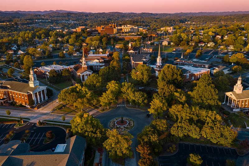 Sunset nearing and long shadows appearing, Church Circle stands bright in Kingsport, TN.